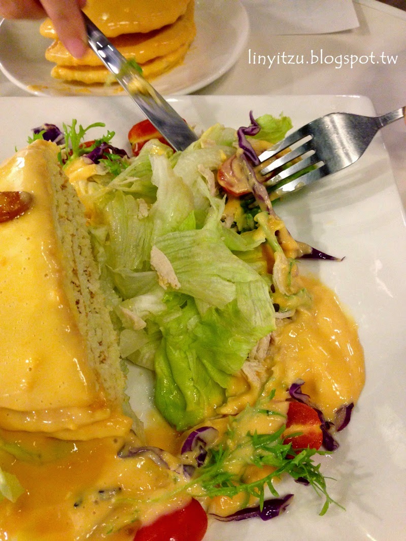 這是鹹的煎餅,主要組成就是:起司醬、煎餅、底下的生菜沙拉(有雞肉)