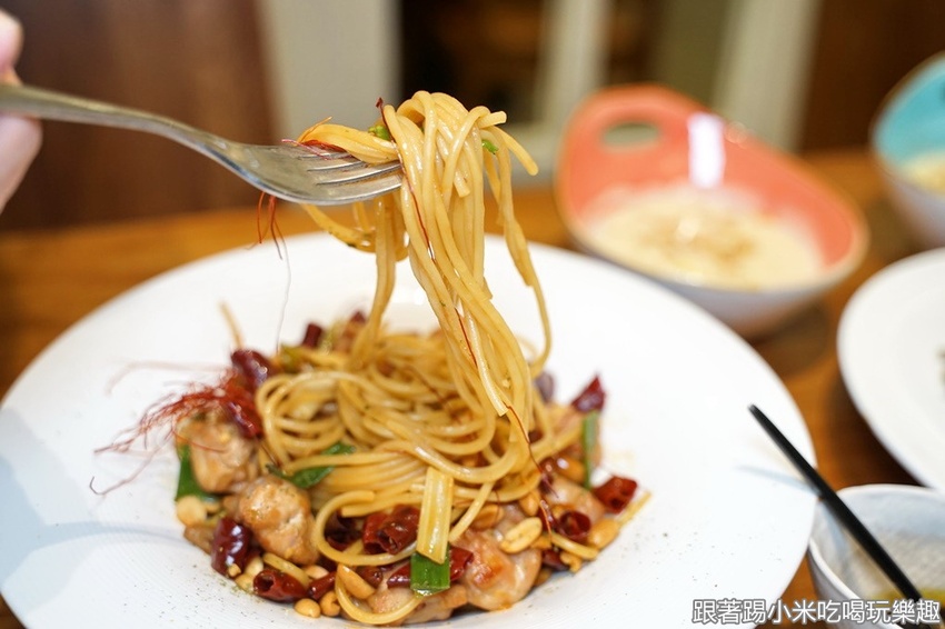 宮保川味雞球義大利麵(300元),這是主廚用中式料理的元素與義式料理的手法融合出來的創意料理!