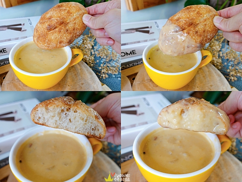 ▲麵包是店家自製的帕瑪森起司手工麵包~使用麵粉、糖、鹽、橄欖油、水、酵母及帕瑪森起司粉製作~並反覆對折成形~等待低溫發酵送至烤箱!口感紮實的麵包帶有淡淡的起司香氣~沾濃湯更美味😋