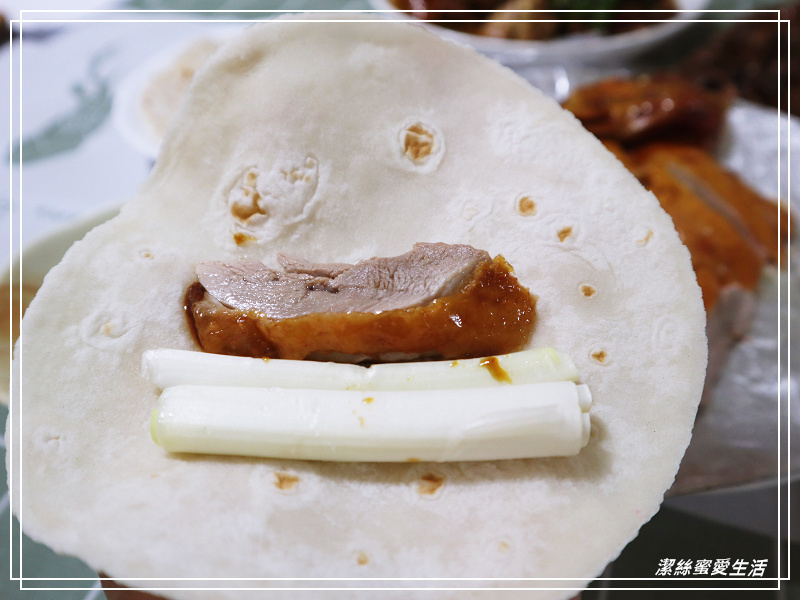 把鴨肉沾上甜麵醬及蔥段再用麵皮捲起來,就是最美味吃法。