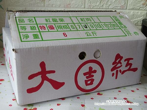 【大紅果園】以自有的紙箱盛裝,紅龍果的等級、規格都標示清楚~