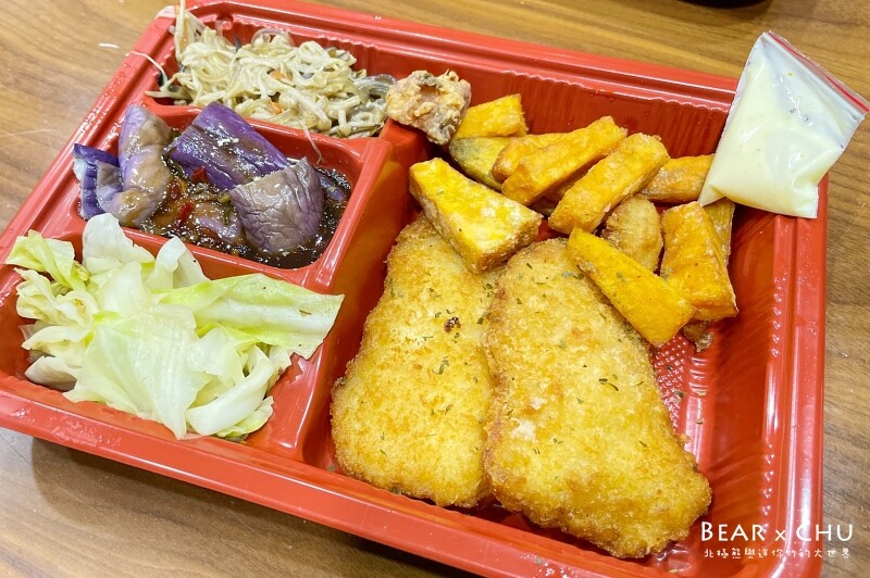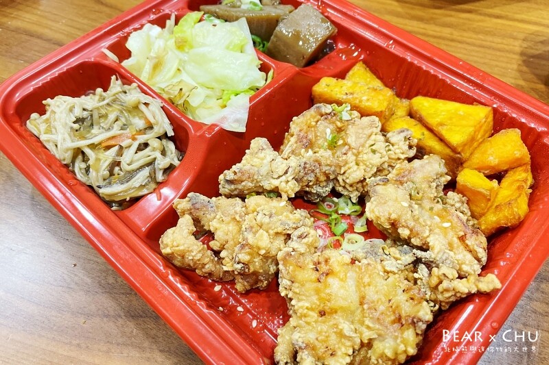 再來看看日食家也是很不錯的主菜菜色,首先是外酥內嫩的味增炸雞,風味部分是另外淋上去的味增醬,吃起來鹹香美味,就算是外帶買回家吃起來也不會軟爛,雖然是炸物但完全沒有油膩感,然後旁邊竟然還搭配了也很好吃的炸地瓜。