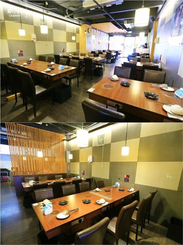 走進店裡,天花板採用黑色及木質調裝潢,牆面是明亮的米色系X淺灰色系,