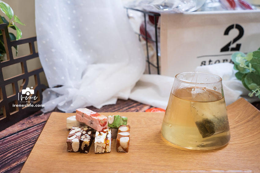雖然牛軋糖低甜度不膩口,但配上一杯無糖的綠茶好享受,一口牛軋糖一口熱茶,