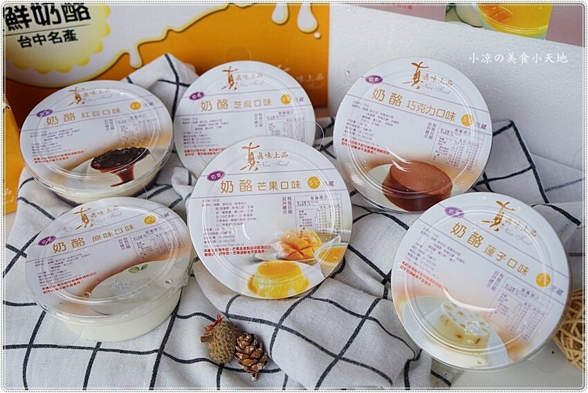 手工鮮奶酪可以選單1口味也可選綜合,一共有6種口味,原味、芒果、芝麻、巧克力、蓮子以及紅豆。禮盒可6入、12入,宅配均以禮盒為主,門市可選禮盒或保麗龍盒(保冰6小時),每一盒鮮奶酪上都會清楚的標示成分、保存期限以及營養標示!