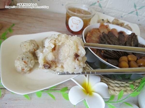 飽滿的栗子、鹹香的臘腸及香腸,整個舖滿在香Q的米糕上,用料真大方~