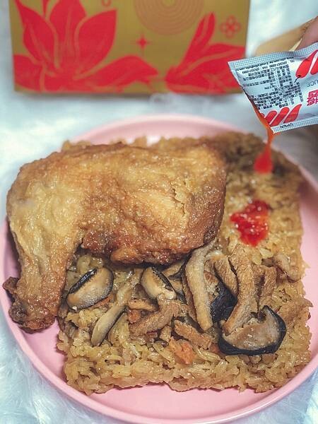 將油飯搭配著嫩雞腿以及充滿祝福意味的紅蛋一同品嘗真的是絕妙好滋味!