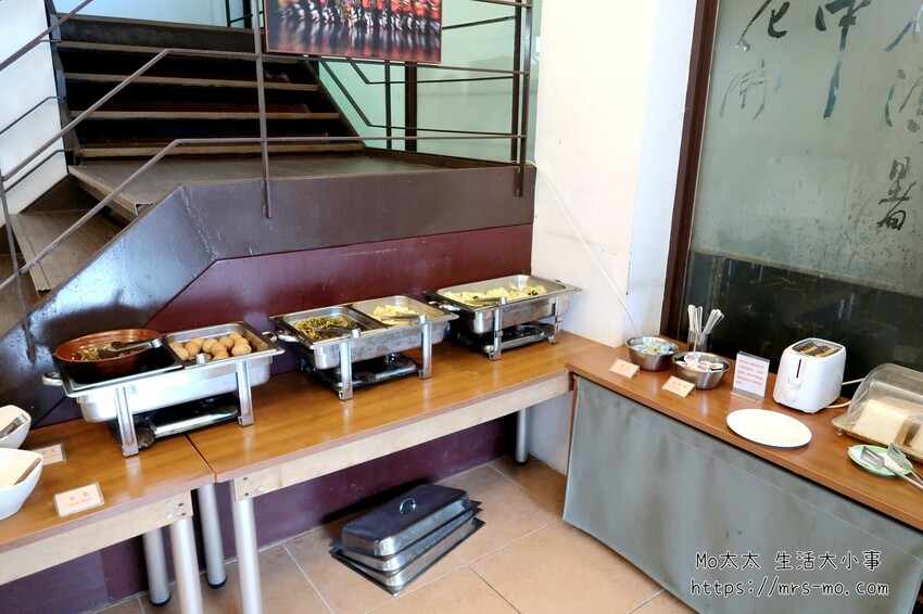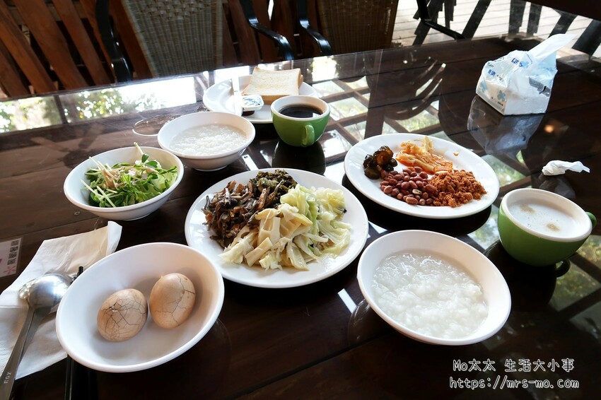 ▼簡簡單單的自助早餐,有吐司、稀飯,醬菜、炒高麗菜、咖啡機、茶葉蛋等