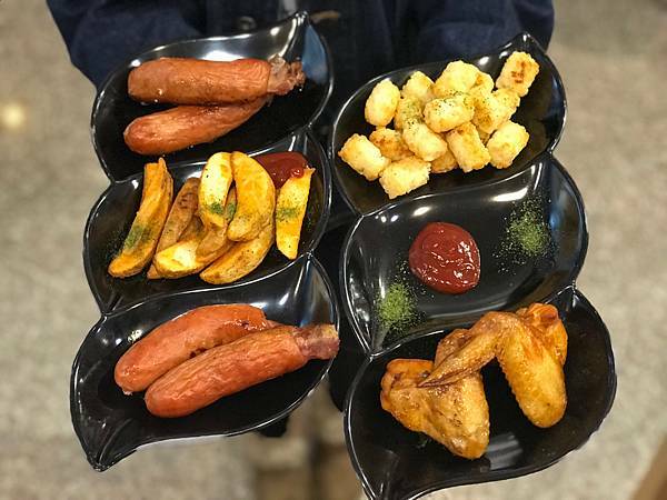 薯球、辣味薯條、德式香腸、檸檬烤翅