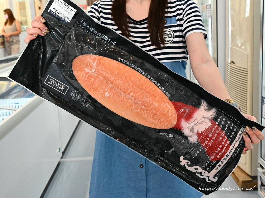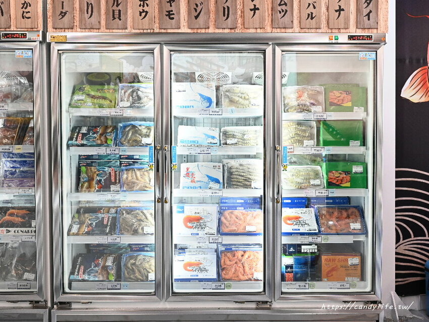 接下來這裡是蝦蝦冷凍櫃,裡頭各式各樣的蝦子通通有,不管是白蝦、草蝦、牡丹蝦、天使紅蝦等,其中最吸引糖糖的就是這款海虎蝦啦,有夠肥美又大隻,跟糖糖手臂差不多呢