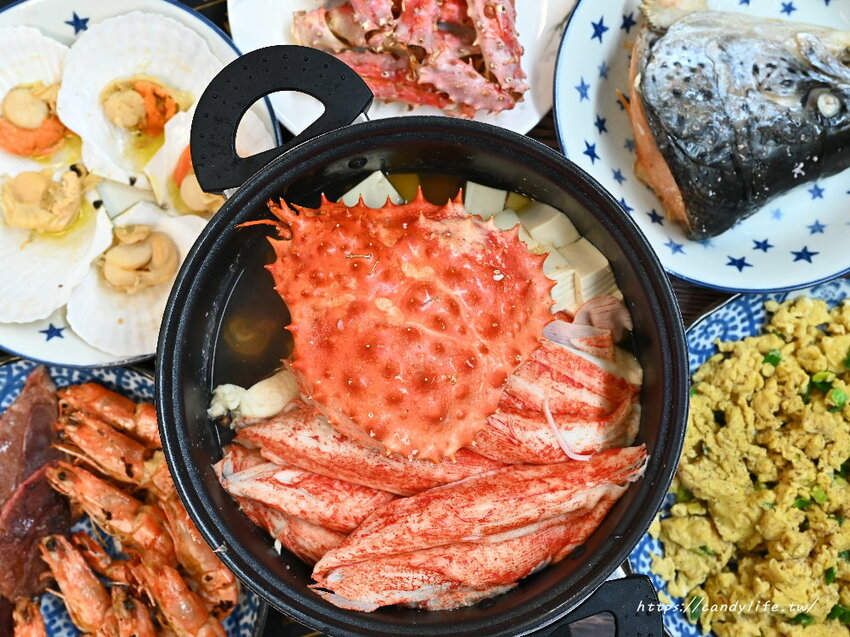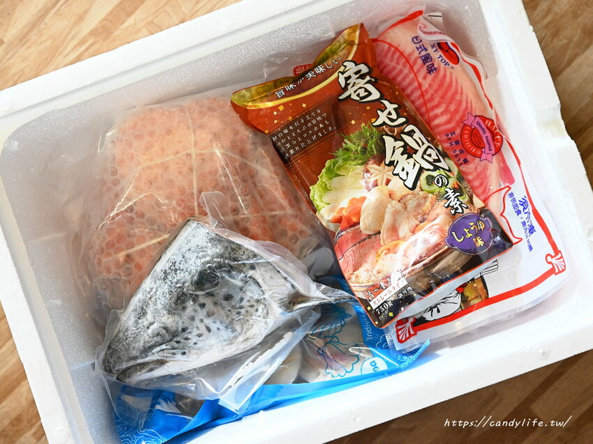 這一箱就是糖糖今天的戰利品,有活凍帝王蟹、鮭魚頭、火鍋湯頭、巨大蟹肉棒、鯛魚片等,剛好可以來煮個超澎派的海鮮火鍋