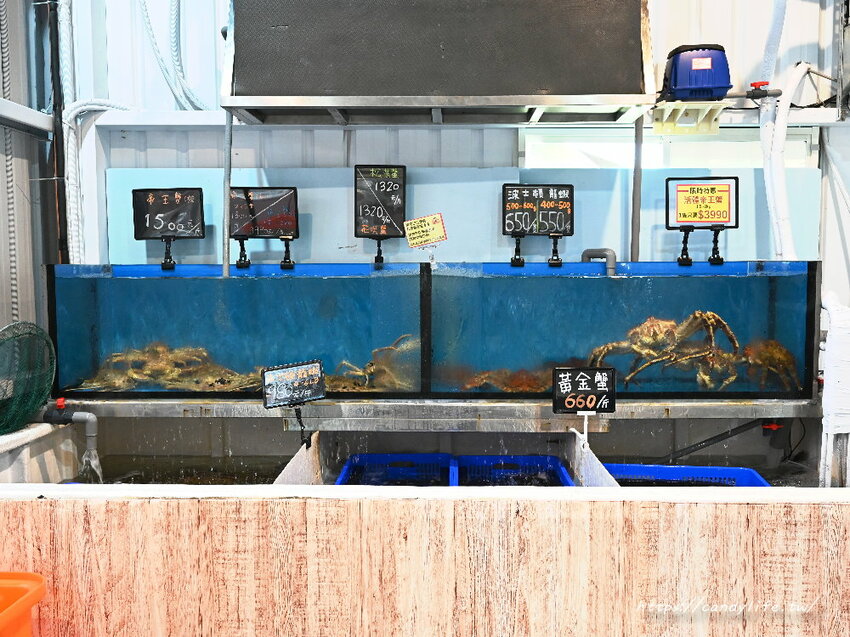 右手邊是恆溫的養殖水箱,裡頭各式各樣的生猛海鮮,像是黃金蟹、帝王蟹、松葉蟹、泰國蝦、波士頓龍蝦等活體海鮮,在村井水產都買的到