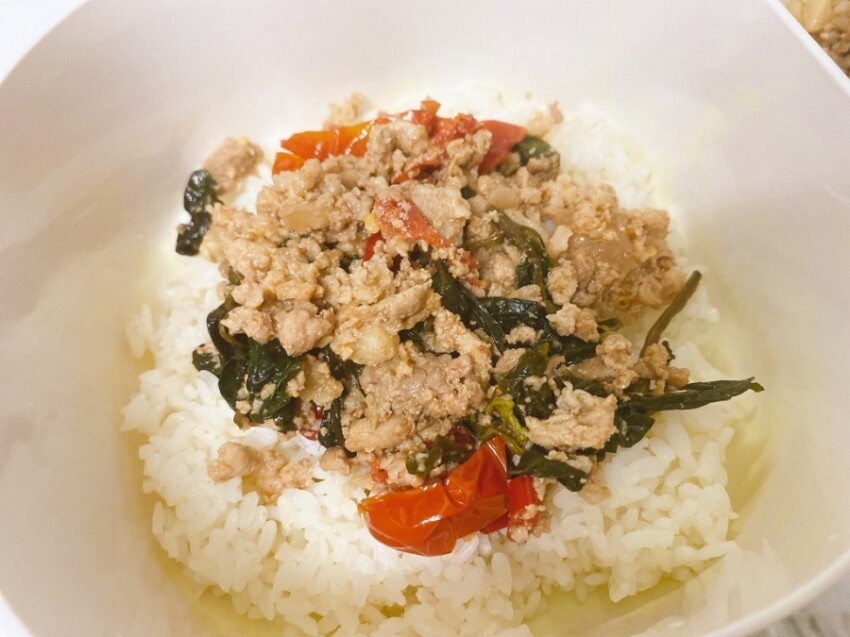 份量十足的打拋豬肉,只要料理時多煮點白飯,把多餘的打拋豬肉放在便當盒裡冷藏!