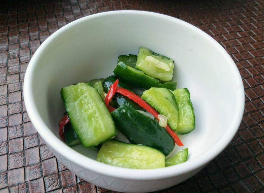 切片的「小黃瓜」加入蒜頭及辣椒進行醃製,入口後香脆爽口,酸香又開胃。