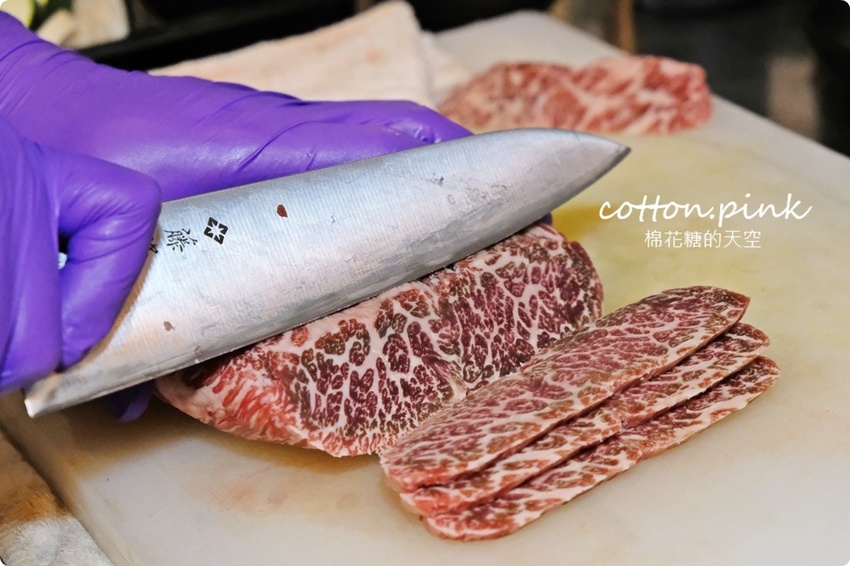 看看這個日本和牛臀心~均勻的油花就像是蕾絲一樣真的超美的!這次想肉燒肉推出兩種等級的禮盒一種是日本和牛、一種是美國牛肉,每一個燒肉禮盒都是在預定取貨時間前才現切準備起來,看著服務人員切片擺盤真的超級佩服的。