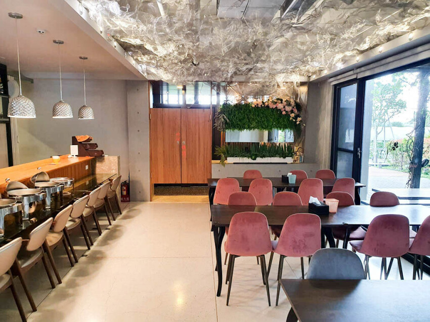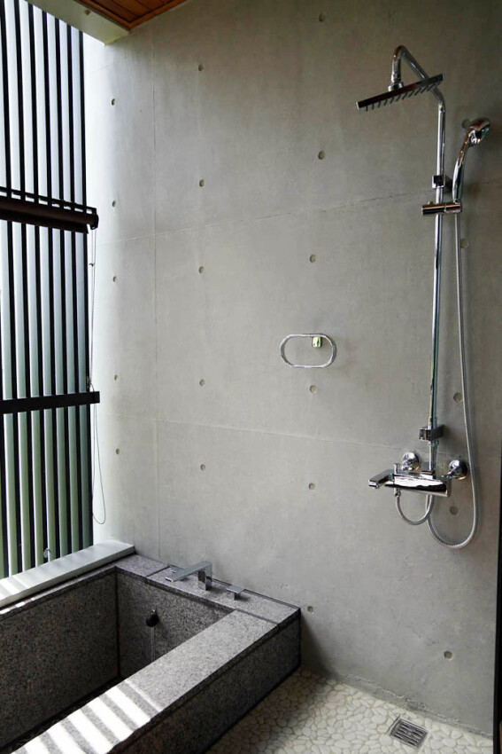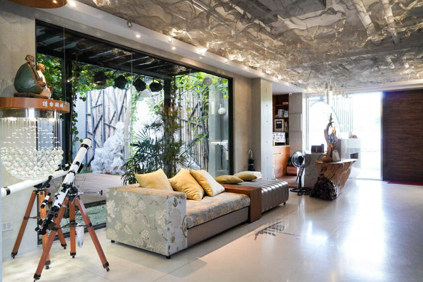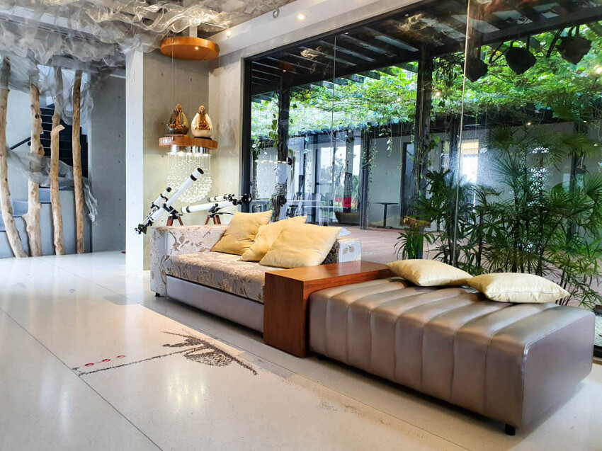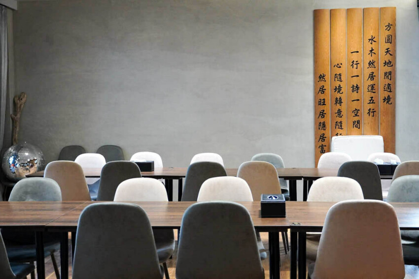 中西合併風格,沉穩質感的清水模結合金、木、水、火、土的五行元素,日式禪風的文雅氣息,讓人一走進來就有平靜放鬆的感覺