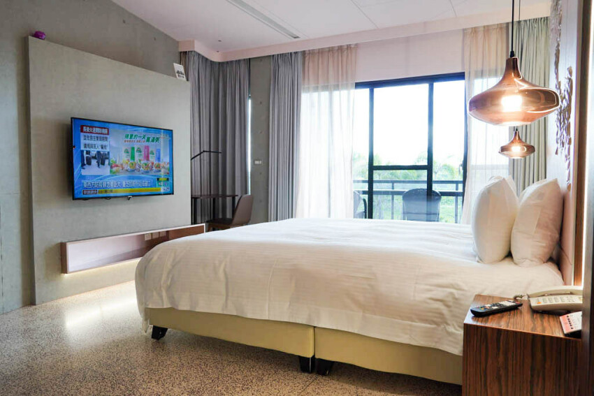 房內有50吋液晶大電視,躺在床上看電視好享受,旁邊也有書桌及檯燈,拉開窗簾就是一片綠意美景