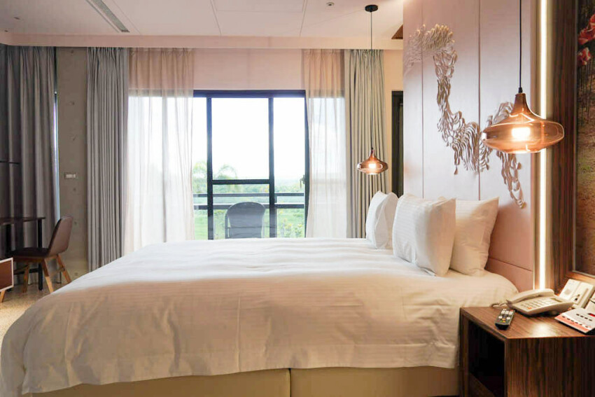 湖景雙人房,面向龍鑾潭湖畔,在房間吹著冷氣,或是在陽台泡湯,直接可以欣賞世界級落日美景喔