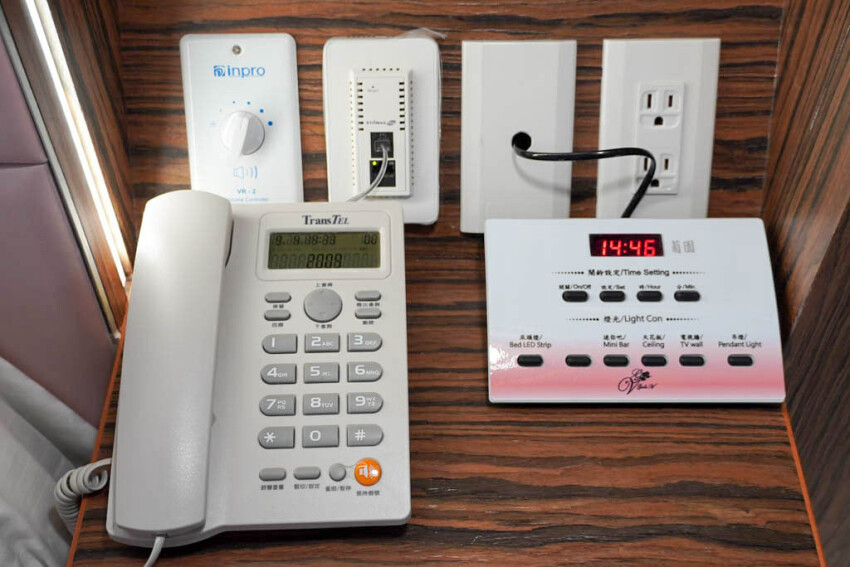 床頭櫃可以控制室內燈光跟鬧鐘,晚上電視看累了,不用起身關燈就可以直接睡覺