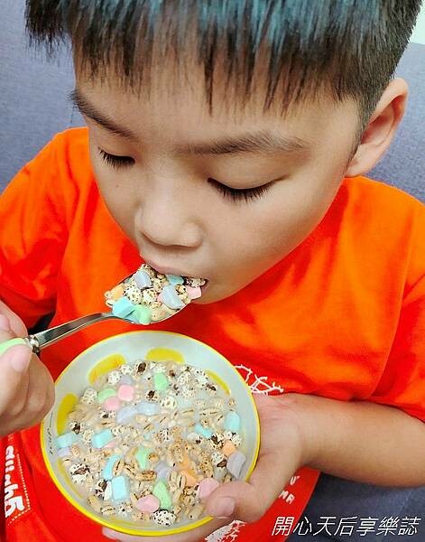 有時候我很忙,沒時間吃飯,也會來一碗『Hearties Puffs 五彩脆 石頭棉花糖與爆薏仁核桐麥』加豆漿止飢,吃一小碗就有飽足感嘍,恩爸比則是喜歡在晚上看盤時,加入熱可可裏,當宵夜點心,吃了止渴、止饑又暖心!
