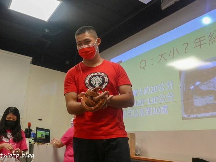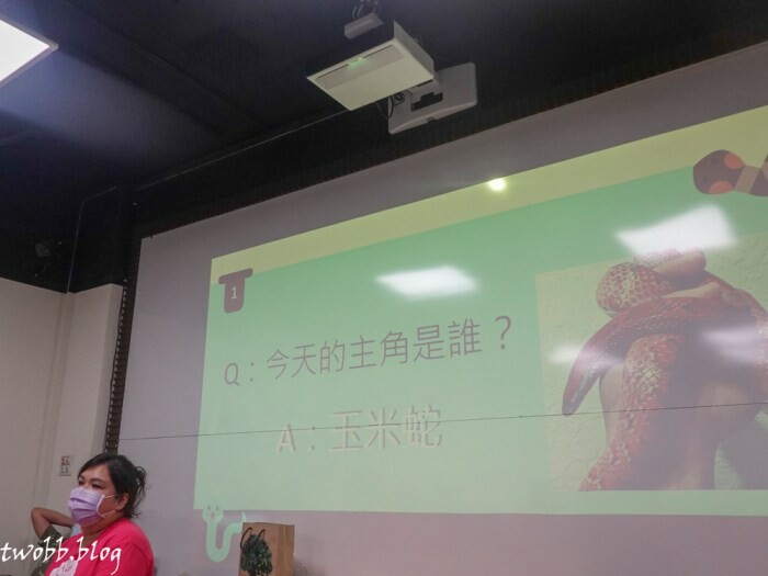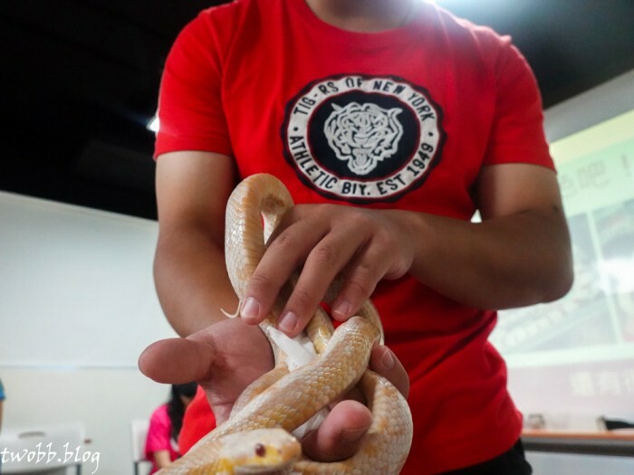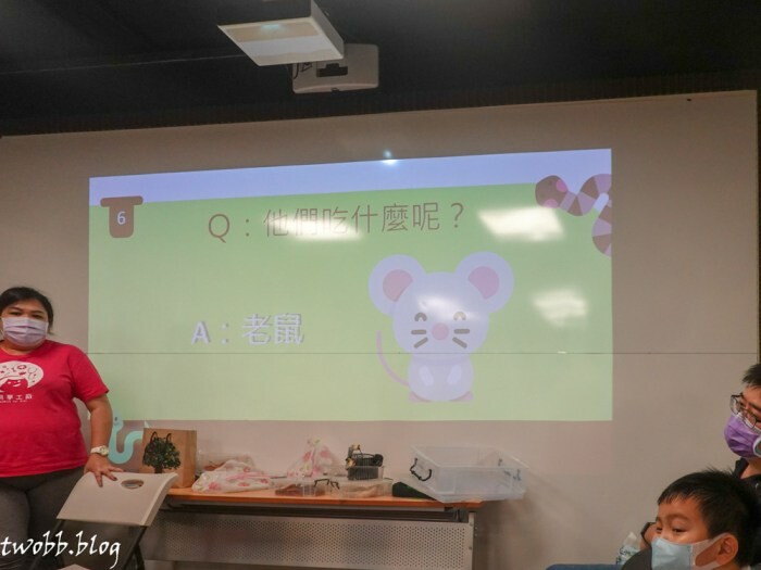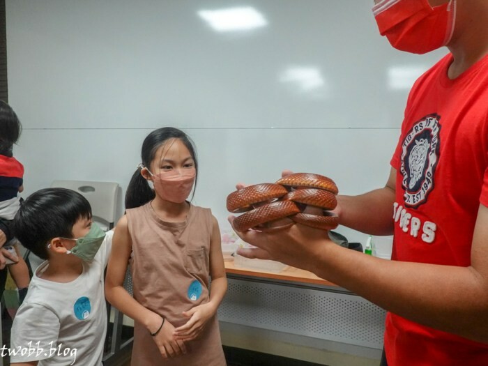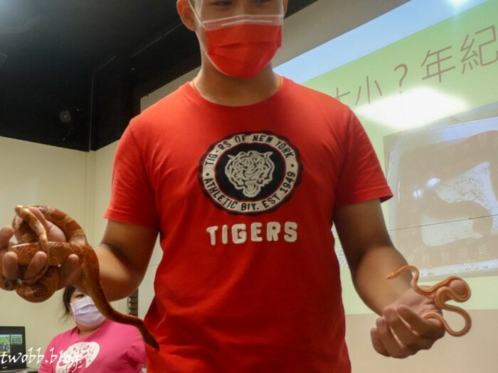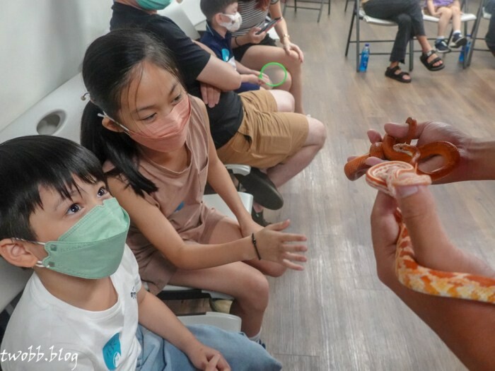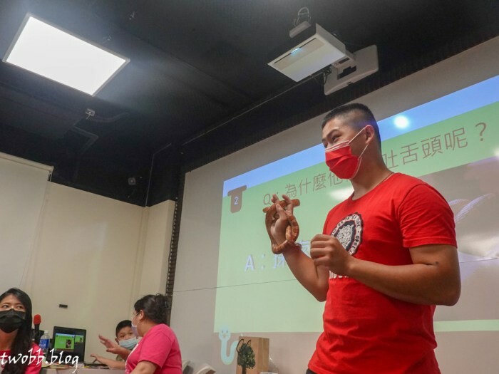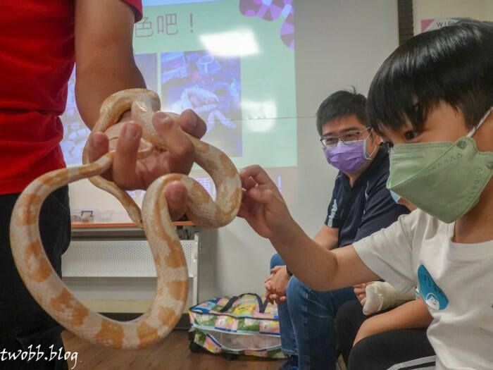 沒想到對玉米蛇有興趣的小朋友這麼多,現場幾乎座無虛席,但一開始小朋友還是對於與蛇互動感到怕怕的,就靠老師生動的課程,慢慢打開小朋友的心防。