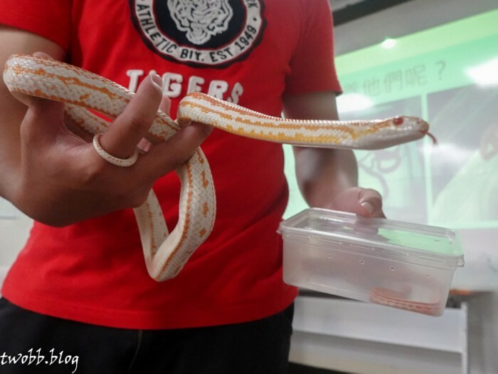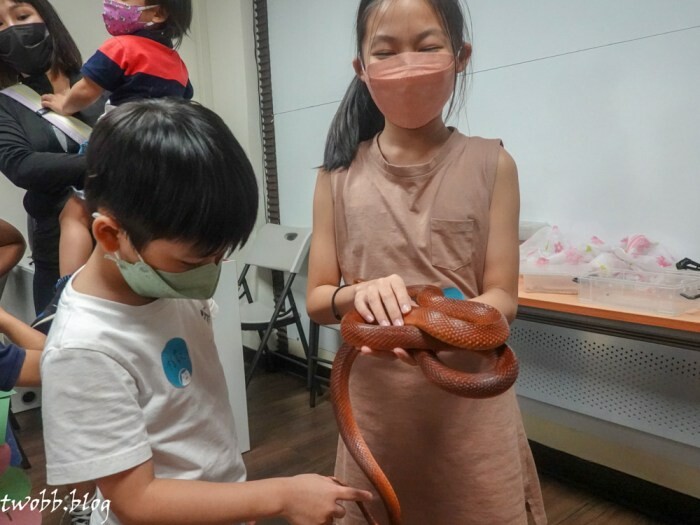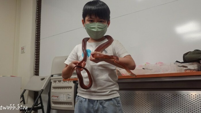 目前還真的很少讓妮與叡產生恐懼感的動物,所以一接收到有玉米蛇互動的課程,手刀就報名參加了。一入教室看到盒子裡活潑生動的玉米蛇,二位非但不害怕,還搶著要往前看。