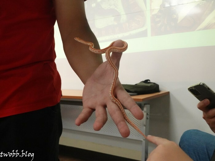 隨著每次講解的項目,老師都會請出不同的玉米蛇一起上課,光是兩隻蛇的年紀大小不同,體型就差很多。看到如此迷你的蛇,戒心瞬間瓦解,現場好多小朋友直呼可愛,看來心防要漸漸打開囉。