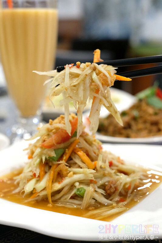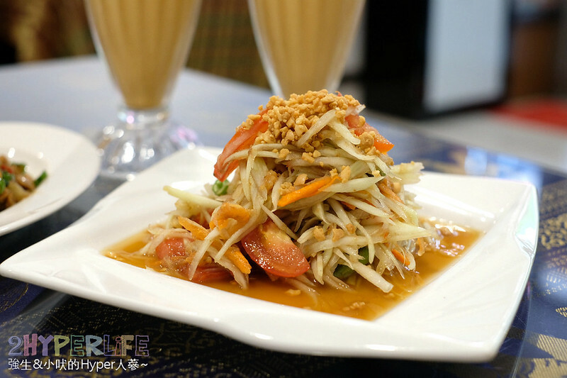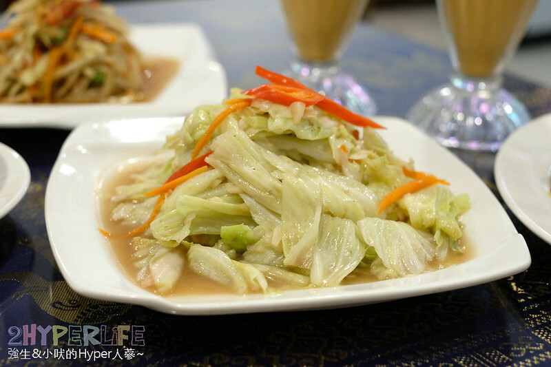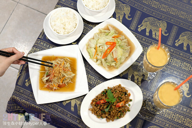 其實兩個人吃這樣算蠻剛好的,不到400元還有飲料。我們這次選擇的雙人套餐菜色是涼拌木瓜絲、蝦醬高麗菜、打拋豬。另外搭配兩杯泰式奶茶