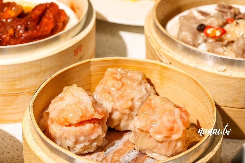 蝦控衝了~仔細瞧燒賣上面躺了一尾蝦仁好霸氣,一籠共有三顆,顆顆看起來飽滿又扎實,豪邁的咬一口,燒賣的皮薄,內餡用料毫不手軟,裏頭包覆著渾厚彈脆的純草蝦漿與豬攪肉,每口盡是滿滿鮮味!