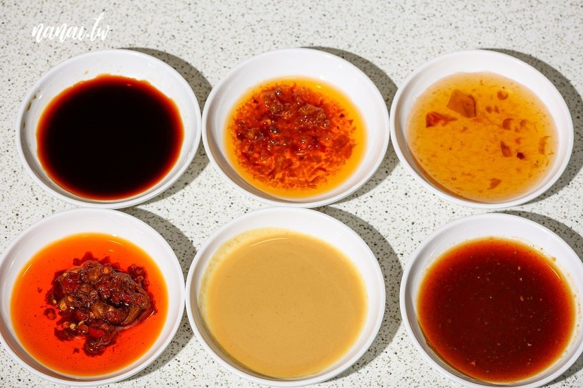 沾醬有辣油、醬油、黃芥末醬、XO醬、蒜蓉醬、冰梅醬,每款沾醬搭配港式小點,層次風味更豐富,像冰梅醬帶有些許紫蘇梅,酸甜口感可解油膩,辣油則是用朝天椒和魔鬼椒等食材,辣度偏辣,無法調整。