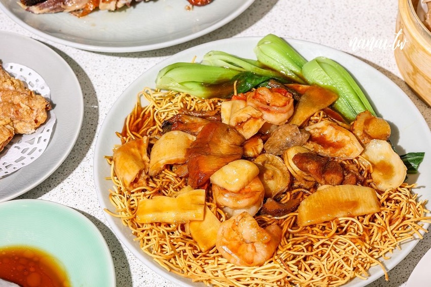 不少人來這吃飯都會點這盤廣炒麵!嚴選廣東炒麵拌入香港師傅特調醬汁下去炸,加入蝦仁、叉燒、扇貝、干貝、海参等五種季節限定食材,再搭配青江菜、筍乾提味,趁著起鍋咬下口,廣炒麵酥酥脆脆,再繼續吃第二口,廣炒麵吸附醬汁,味道上不會太死鹹,多了蠔油甜味與海鮮的鮮味,滋味獨特挺不賴。