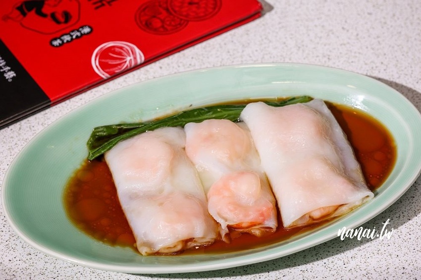 腸粉是港式飲茶必點!咱們來一份八玖鼎港的招牌鮮蝦韭黃腸粉,米漿是店家自己做,中間包入韭黃、2顆飽滿鮮蝦,再淋上特製醬汁,讓人回想起前幾年去港澳的時光。
