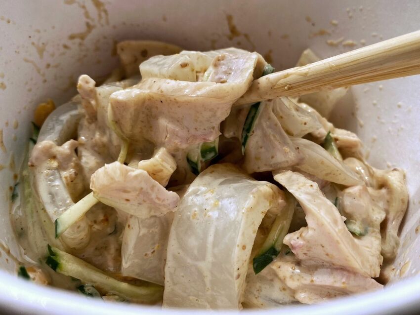 裡面有新鮮帶皮的雞肉片、小黃瓜絲、增添口感的花生,底部滿滿的涼皮