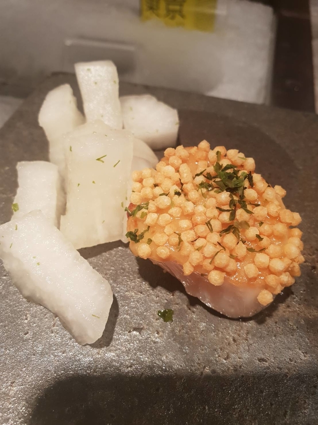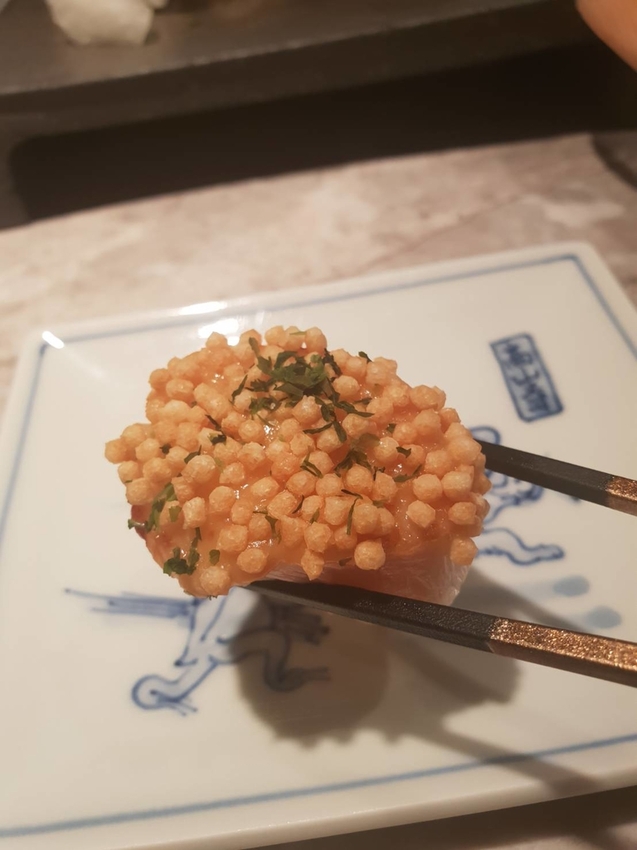 炙燒生魚片佐米香!這道很清爽!蠻特別的!