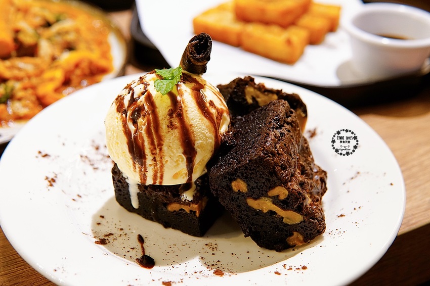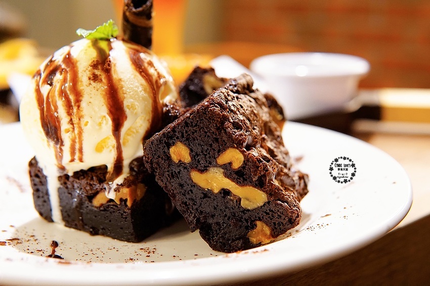 一上桌時,最讓小荻驚豔的是,這布朗尼的厚度也太厚了吧,不誇張,真的叫人滿足,尤其是咬下的瞬間,扎實的布朗尼搭上顆粒感的核桃,香濃滋味,讓人甜蜜在心頭,只有滿滿的幸福感,再搭上香草冰淇淋,冰冰涼涼的超級消暑。