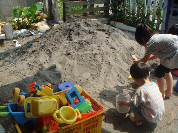 就現場點現場做,在等Pizza的時間,三孩兒就在外頭玩沙堆