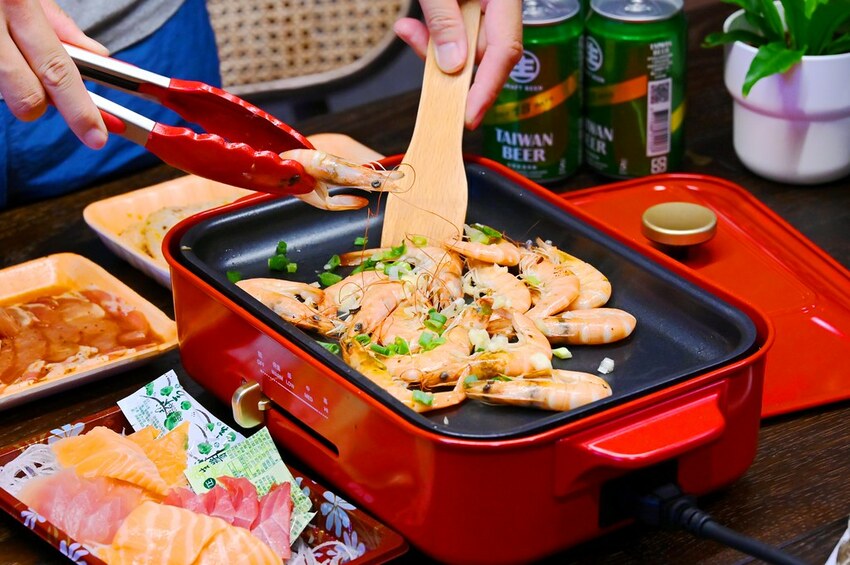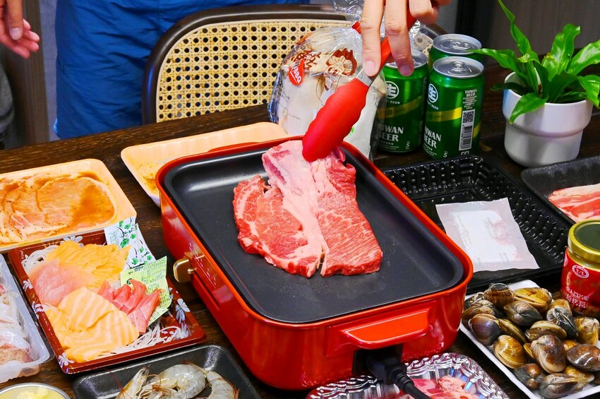 這天差不多買了1600元的食材,有美國雪花燒烤牛肉片、冷藏肩胛肋眼牛排、澳洲和牛燒肉片、蒜味烤豬肉片、蒜味二節翅、現撈白蝦、綜合生魚片(16片)、活蛤蜊、杏鮑菇跟18天生啤酒。份量我覺得差不多夠2-3人吃了。