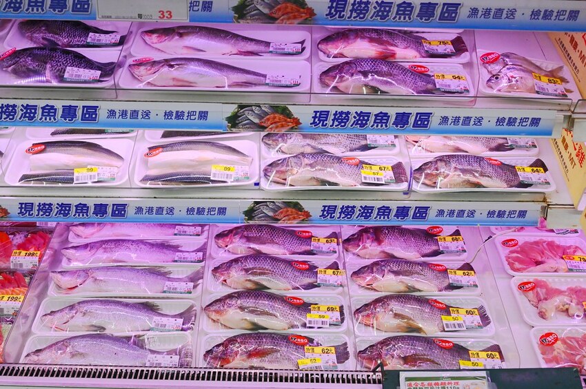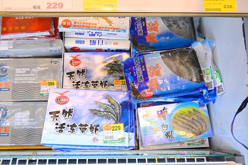 在海鮮櫃部份,有多種鮮魚可以選購,烤肉必備的現撈白蝦、現撈蛤蜊鮮蚵等等也都一應俱全而且是衛生包裝,