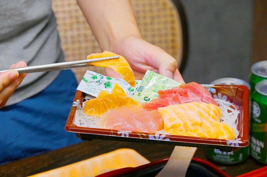 再來「綜合生魚片」真的划算,16片可以選擇單買鮭魚或綜合,片切的厚度口感都挺新鮮(也有附醬油跟哇沙米)