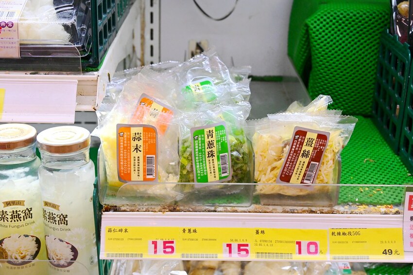 這邊也有賣幫你切好的青蔥、薑絲跟蒜碎的小包裝,像我這種懶人非常適合,打開包裝就能料理。