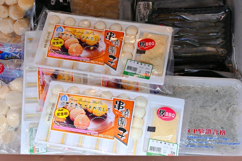 裡面還有一堆冷凍白蝦、草蝦等等,好像比現撈的都還大隻,另一邊還有冷凍干貝、松葉蟹味腿、花枝丸、鱈魚丸等等比較高價的海鮮食材,甚至每次去燒烤店最愛吃的花生烤麻薯串這邊竟然也有賣!是小朋友會瘋狂愛上的小甜點!