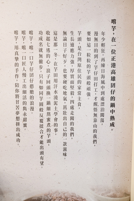牆上寫著嚐芋創辦人的故事,訴說著與芋頭相遇的經過,以及創立嚐芋的心境。