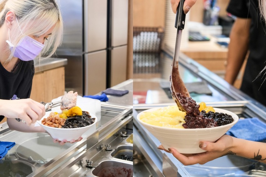 點好後,店員就開始製作我們的餐點囉。挫冰、淋上黑糖漿,這是嚐芋的冰品基底。黑糖很香,可是因為挫冰配料本身就有甜度,所以如果平常習慣無糖的,建議可以請店員不要加黑糖,直接給清冰就很夠味。