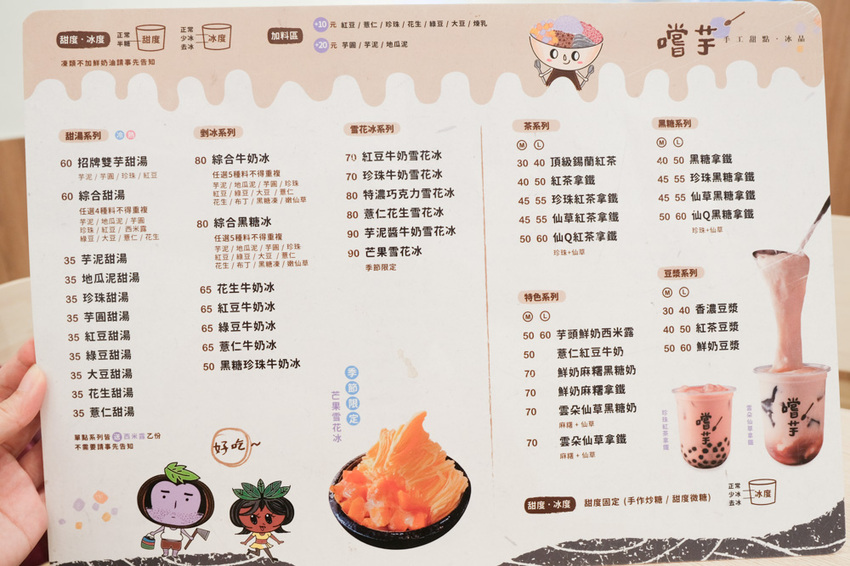 嚐芋的菜單種類好多喔~仙草、豆花、布丁、黑糖凍、雪花冰,可以單點也可以選綜合的自己搭配各種剉冰配料,想吃什麼自己選,糖冰都可以調整、客製化。如果覺得綜合冰只能選 4 ~ 5 樣配料不滿意,還可以再另外加價加購剉冰料,想吃多飽就有多飽(笑)