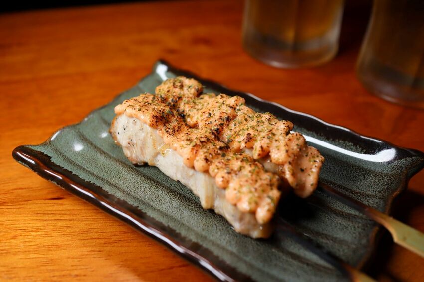 嫩口多汁的雞腿肉搭配上明太子醬~來呀~麻煩老闆再來杯酒(爽快)