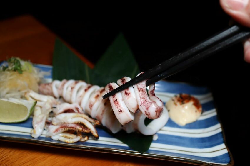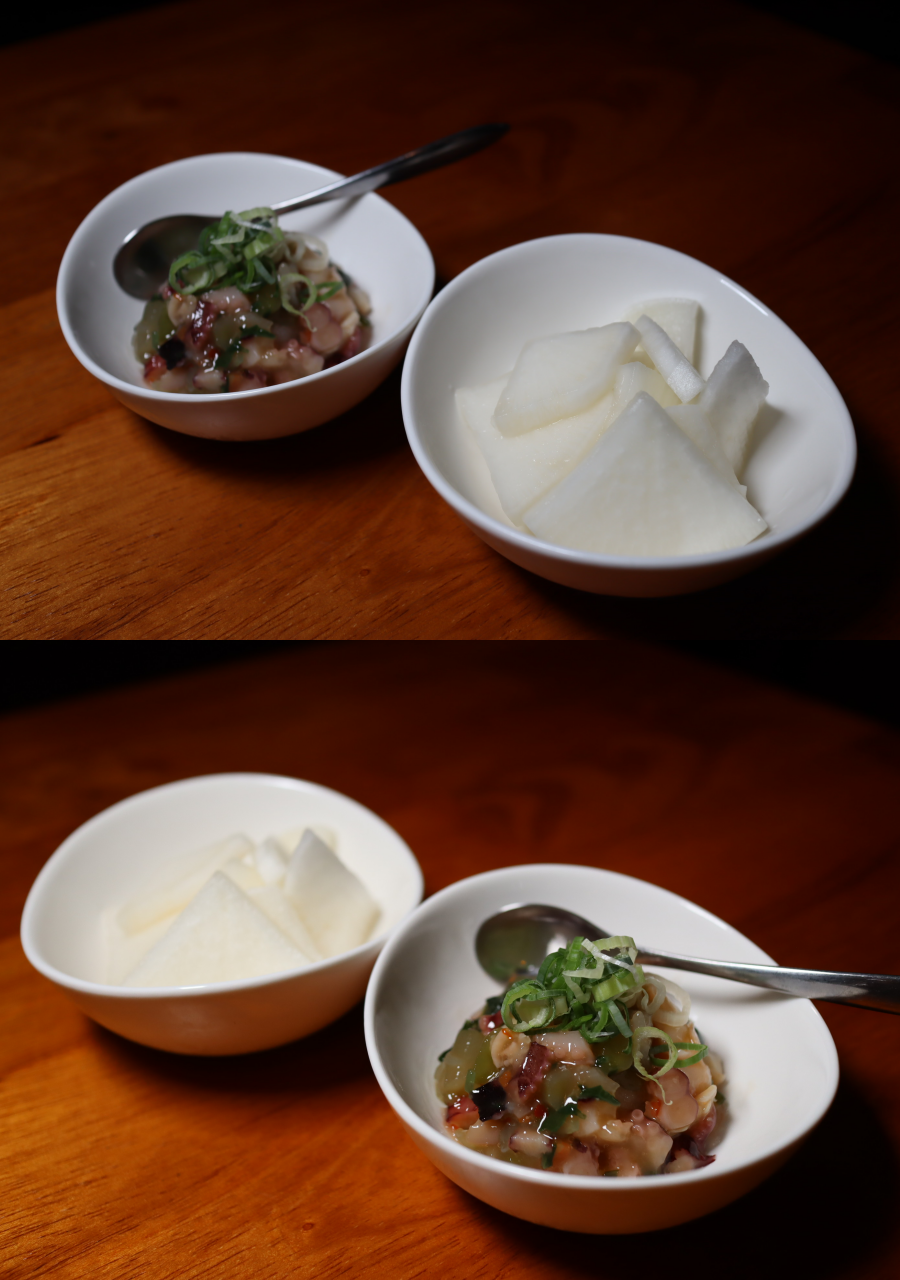 芥末小章魚:QQ的小章魚拌上微微嗆鼻的芥末,底下搭配上細密的白蘿蔔泥