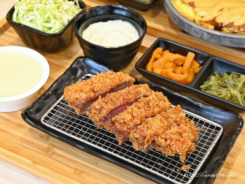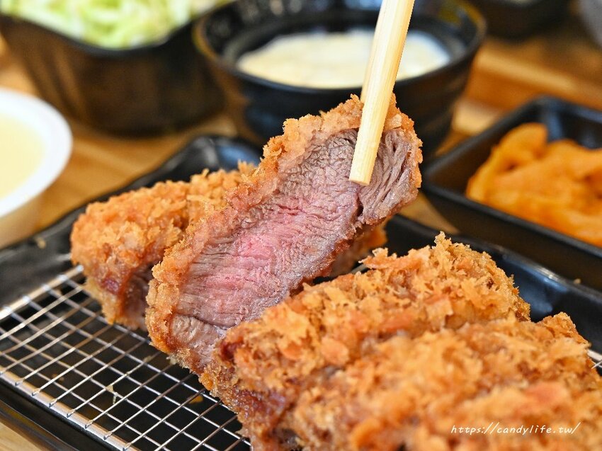 想吃炸牛排在京厚屋也吃的到,採用厚實的板腱牛肉,裹上麵包粉下去酥炸至七分熟,裡頭肉質還呈現粉嫩色澤,只要點定食均會附上高麗菜絲、茶碗蒸及兩道日式小菜,每桌均會附上高麗菜絲醬料可以依喜好自行做添加
