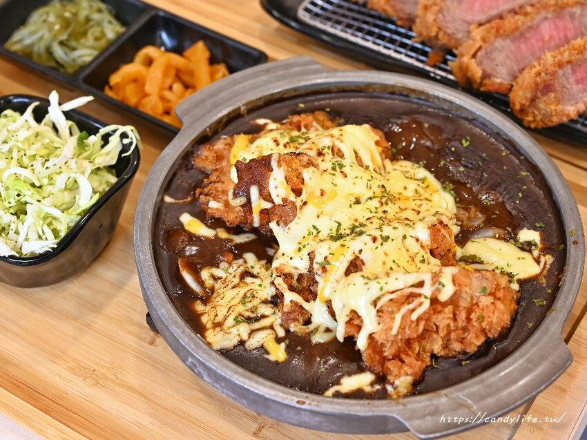 京厚屋的咖哩有黑咖哩跟黃咖哩,糖糖選的是黑咖哩搭配腰內肉豬排,糖糖還額外加點了焗烤熔岩起司,豬排上頭鋪上滿滿起司下去炙燒,畫面看起來超邪惡