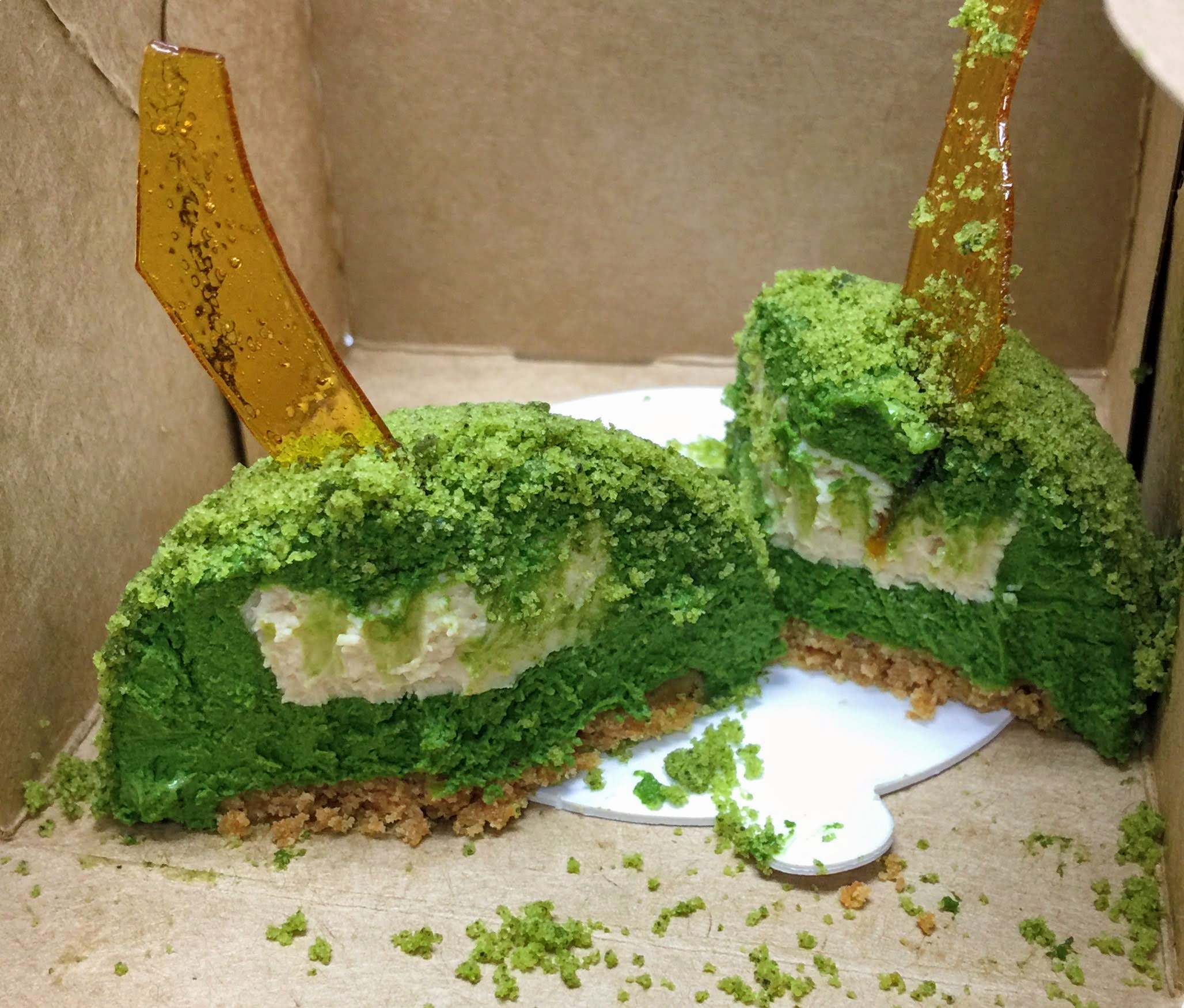 抹茶蛋糕碎屑、抹茶慕斯、牛奶糖慕斯、餅乾底;