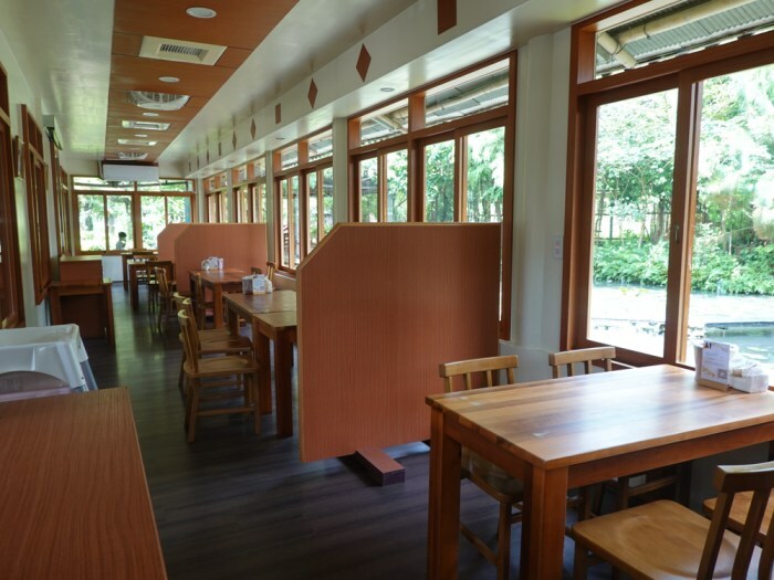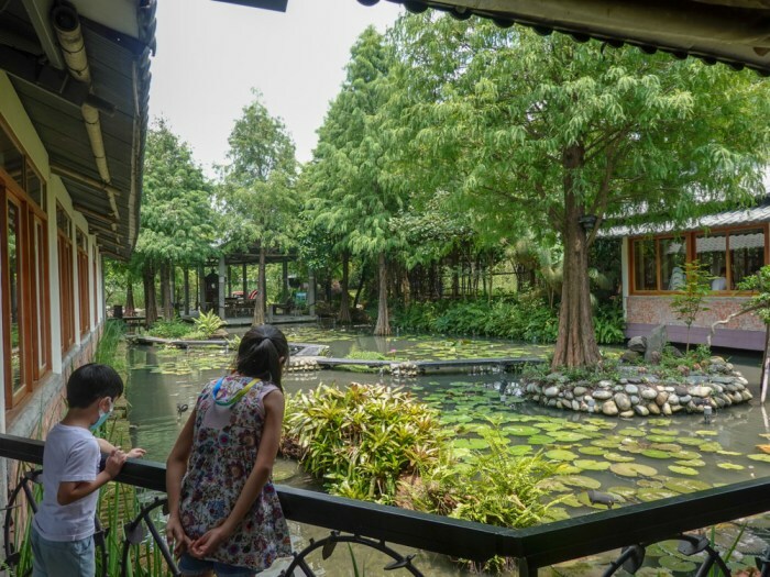以中間的湖畔為分界,二邊各有包廂式用餐空間,所以不管在室外、室內,轉頭就能看見美景,欣賞湖面優游的小魚,聳立的綠樹。